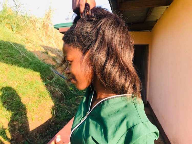 Young lady removing her wig on her return from school.