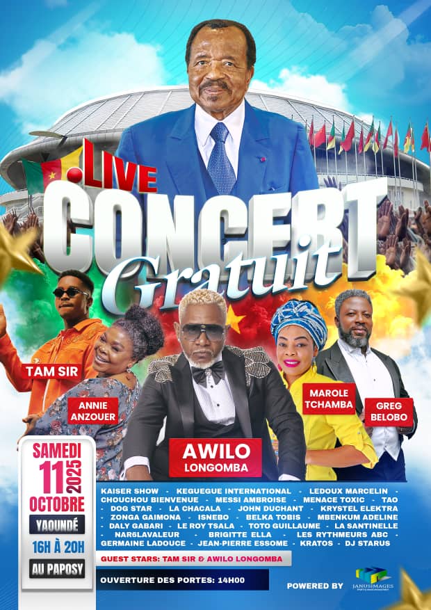 Un grand concert gratuit aura lieu ce samedi 11 octobre 2025, à partir de 14 heures, au Palais Polyvalent des Sports de Yaoundé, pour marquer la fin de la campagne présidentielle du président sortant, Paul Biya.