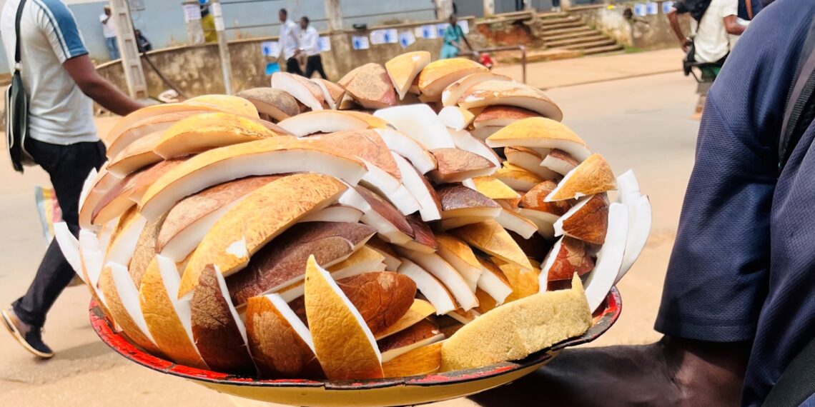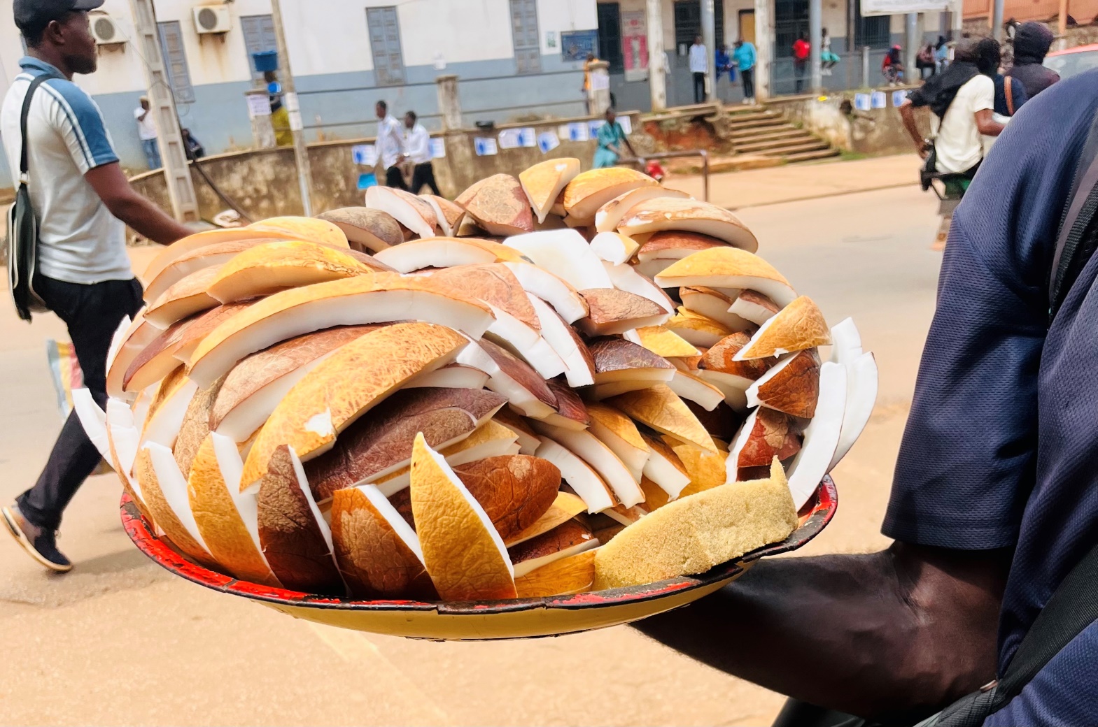 “The gain is really encouraging, that is why I still do the selling,” says Wang Donald, a nuts seller who finds gain in cutting nuts and selling in a tray on his head. His day starts very early in the morning, when he goes to buy nuts at a good price. He knows how to make a profit from what he buys. He says for example, one large nut that costs 500 FCFA can be cut into 7 or 8 smaller pieces. He then sells each piece for 50 FCFA or 100 FCFA, depending on the size. Wang Donald does not have a big shop he walks with his nuts in a tray proposing to passer-by’s.