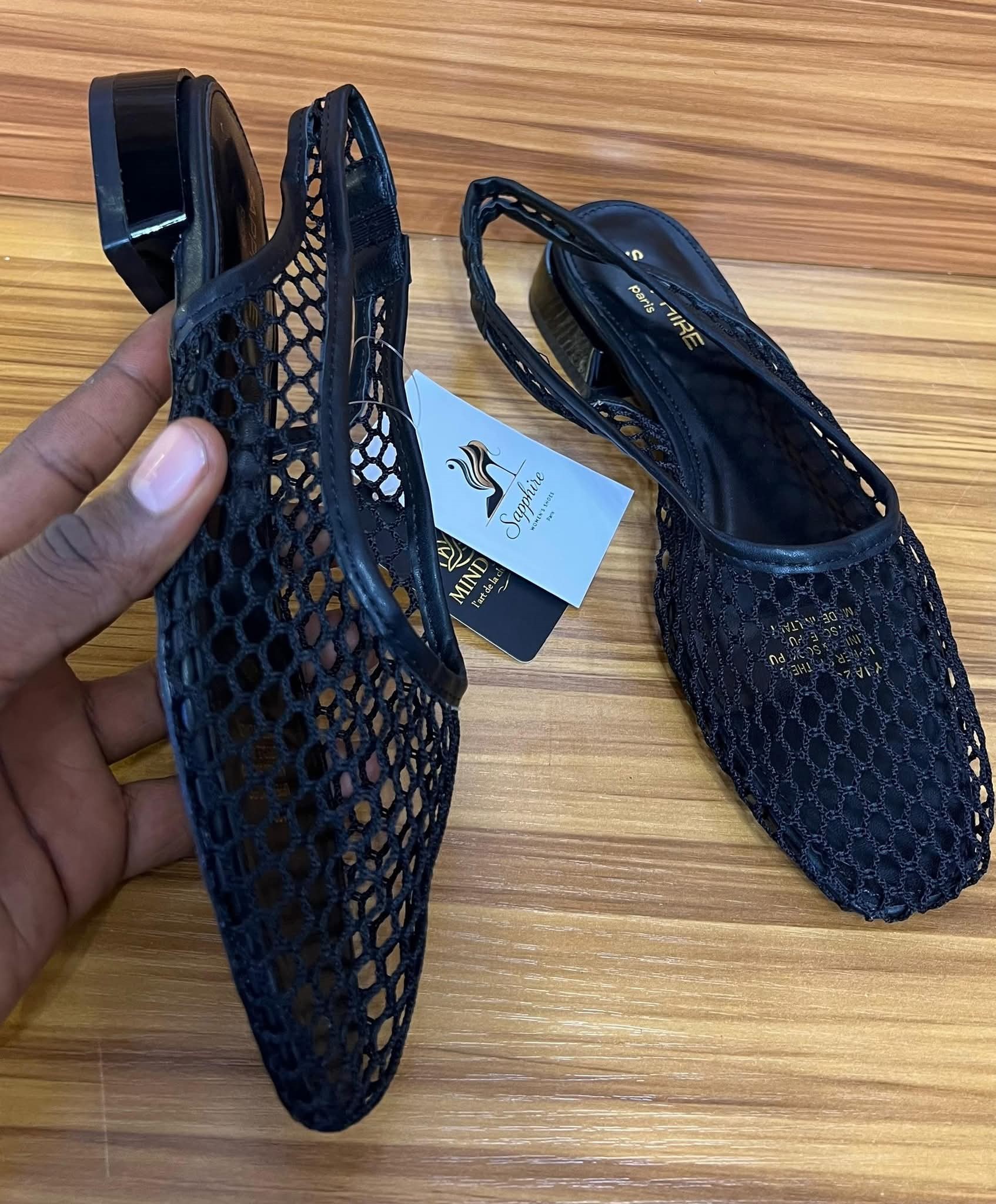 Pour Laurielle Noulenene, étudiante à l’Université Catholique d’Afrique Centrale, les mesh flats sont les chaussures idéales : « Elles sont confortables et sèchent rapidement si elles prennent l’eau. Et elles vont avec presque toutes mes tenues », explique-t-elle. Le talon est plat et peu marqué, ce qui leur confère leur forme caractéristique de ballerine. Certaines versions comportent des détails comme des broderies, des nœuds, des renforts opaques au niveau des orteils ou du talon, ou encore des lanières qui assurent un meilleur maintien. Elles existent en plusieurs couleurs et tailles, adaptées à un usage quotidien.
