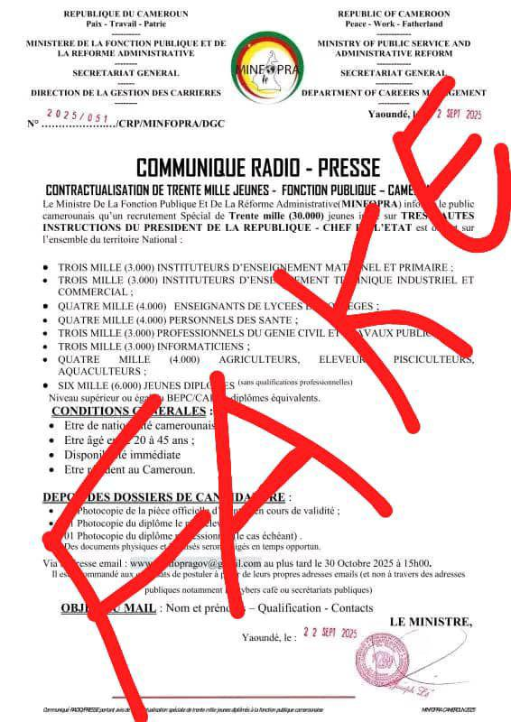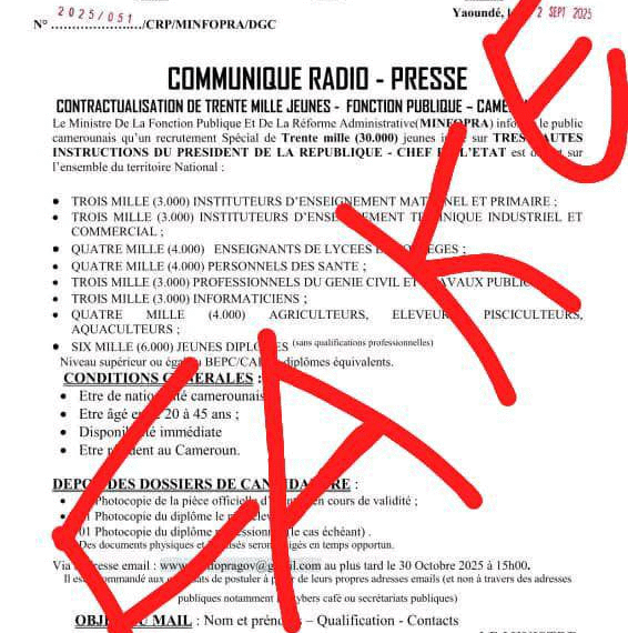 Depuis quelques jours, une image d’un communiqué de presse attribué au ministère de la Fonction publique et de la Réforme administrative (MINFOPRA) circule abondamment sur les réseaux sociaux. Elle annonce une prétendue contractualisation de 30 000 jeunes Camerounais dans plusieurs secteurs de la fonction publique : éducation, santé, agriculture, travaux publics, etc. À première vue, l’annonce semble crédible avec un langage administratif soigné et un cachet ministériel. Pourtant, un élément visuel attire immédiatement l’attention : la mention “FAKE” apposée en rouge en travers du document.