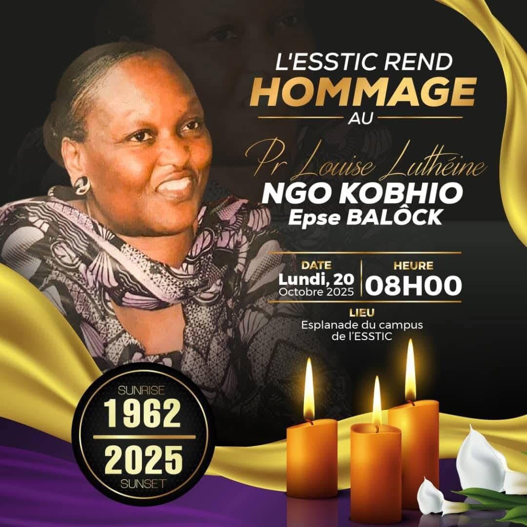 Lundi 20 octobre 2025, à partir de 8 h, l’École supérieure des sciences et techniques de l’information et de la communication (ESSTIC) organise une cérémonie en hommage au Pr Louise Lutheine Ngo Kobhio, épouse Balôck. Sur l’esplanade du campus, la communauté universitaire, les proches, amis et collègues sont attendus pour honorer la mémoire d’une enseignante qui a profondément marqué le monde académique.Cet hommage vient saluer le parcours d’une intellectuelle rigoureuse et d’une pédagogue accomplie, dont la contribution à l’enseignement supérieur au Cameroun reste exemplaire.